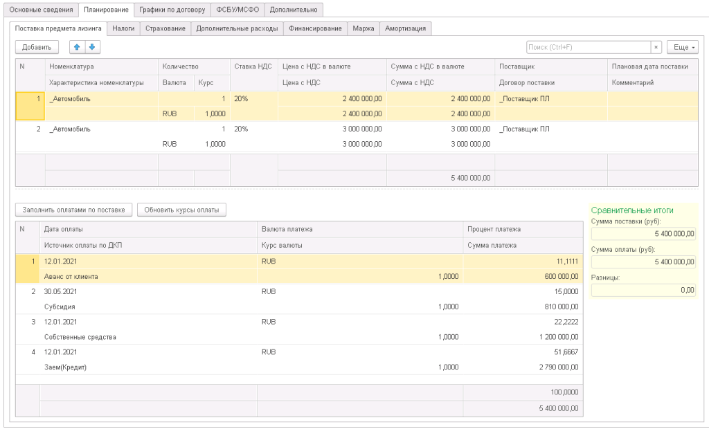 Операции поставки предметов лизинга в «1С:Управление лизинговой компанией. Расширение для 1С:ERP» дополняют типовой функционал решения «1С:ERP Управление предприятием» («1С:ERP. Управление холдингом») и включают в себя: