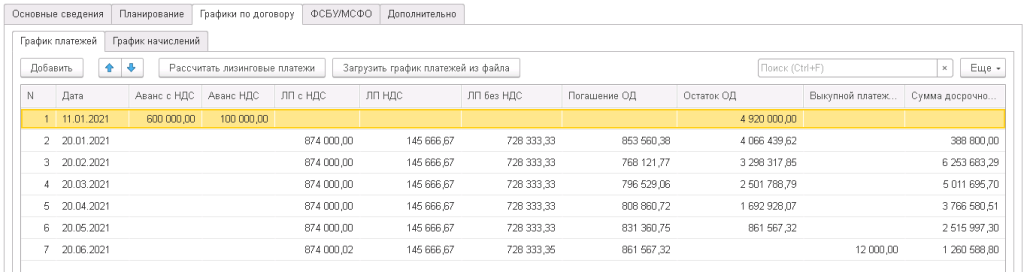 Предварительно рассчитанные в модели графики платежей и начислений по результатам переговоров с лизингополучателем могут быть изменены, дополнены или загружены из внешних источников.