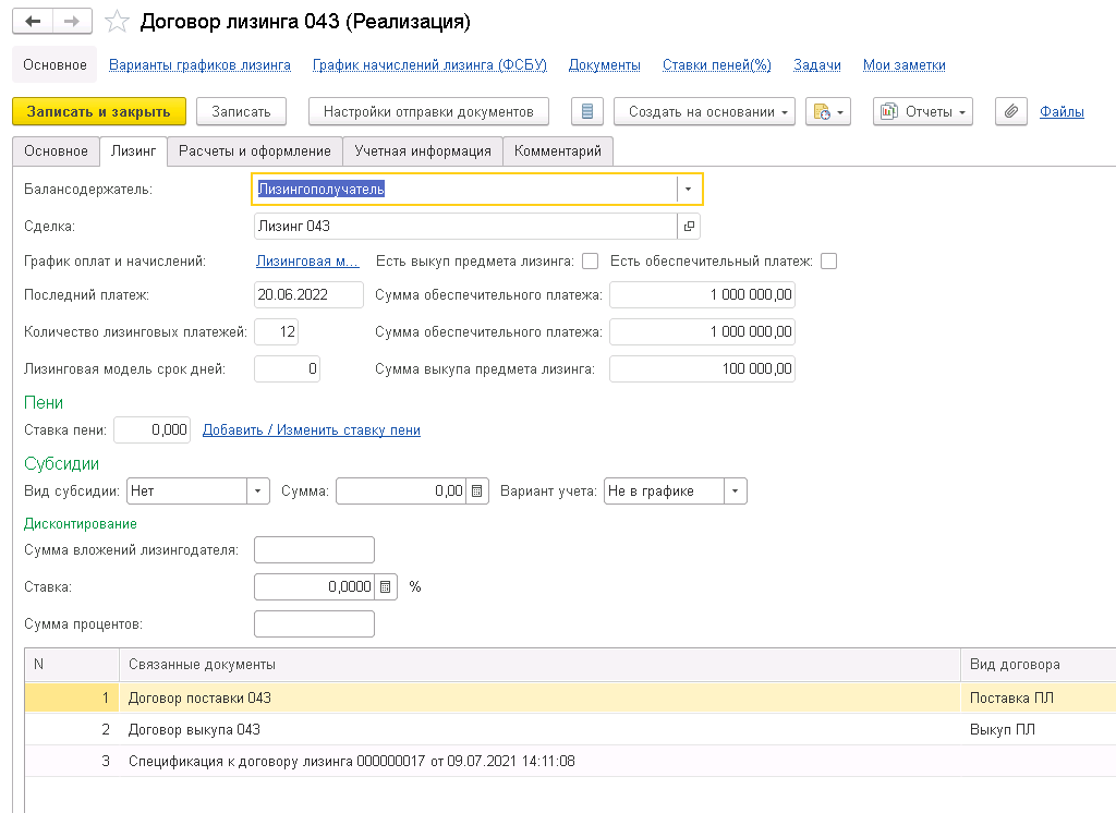 Подсистема реализует возможности ввода и регистрации всех основных данных, условий и связей участников лизинговой сделки. Договор лизинга (договор с лизингополучателем) дополняет типовой функционал «1С:ERP Управление предприятием» («1С:ERP. Управление холдингом») по ведению договорной деятельности, а также влияет на формирование условий договора поставки, договора кредитования, договора страхования и других договоров и документов, связанных с лизинговой сделкой; подсистемой обеспечивается регистрация и поддержка связей между договорами непосредственно с договором лизинга.