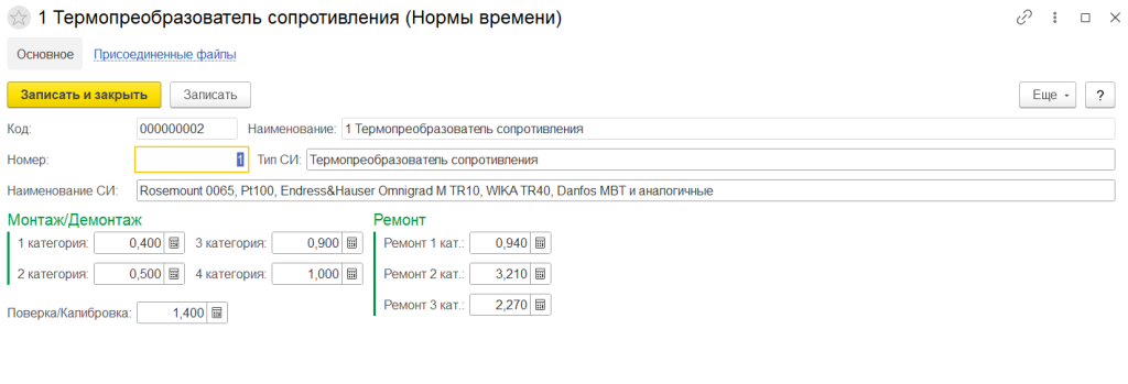 Справочник «Нормы времени» позволяет фиксировать нормы времени на каждый вид работ для конкретной модификации типа средств измерений в человеко-часах: