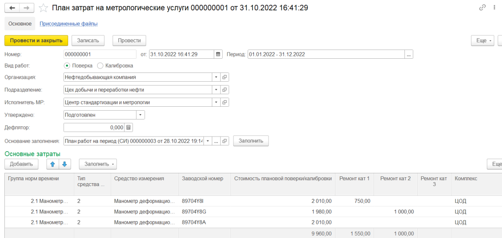 Планирование и регистрация затрат на проведение метрологических работ