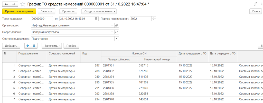 Документ «График технического обслуживания средств измерений» позволяет планировать работы по техническому обслуживанию: