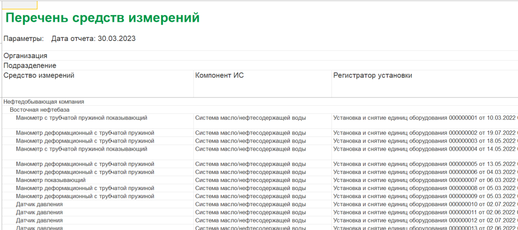 - Учет организационной структуры и структуры мест установок метрологического оборудования с возможностью привязки к основному оборудованию;