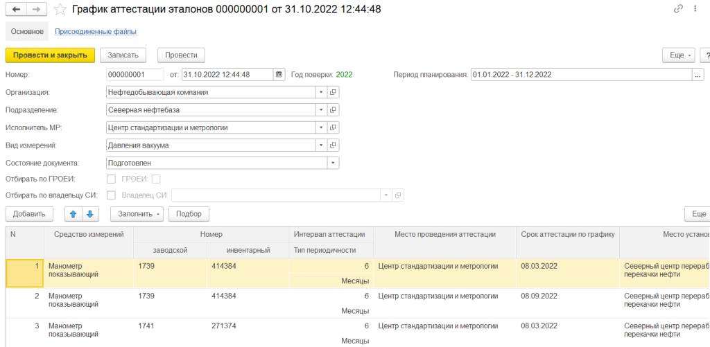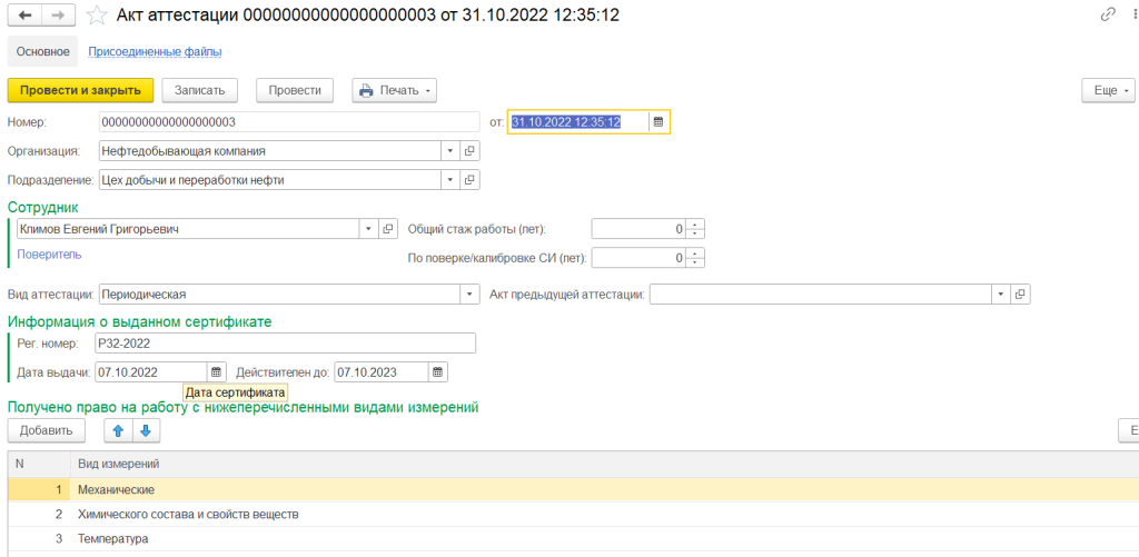 Для учета актов аттестации эталонов в системе реализован документ «Протокол к аттестату эталонов». Так же в системе реализована возможность регистрации результатов проведения аттестации испытательного оборудования.