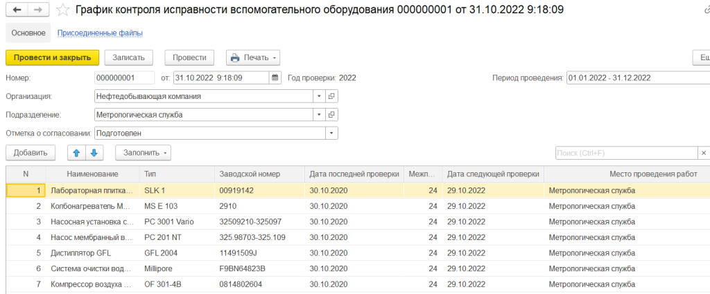 Для регистрации фактов проведения контроля исправности вспомогательного оборудования в системе реализован документ «Акт проведения контроля исправности».