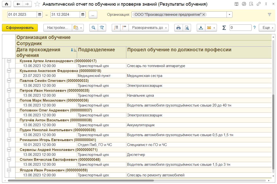 Система позволяет осуществлять планирование и фиксацию результатов проведения стажировок, инструктажей, обучения и проверок знаний сотрудников в области окружающей среды. Реализовано формирование следующих документов: