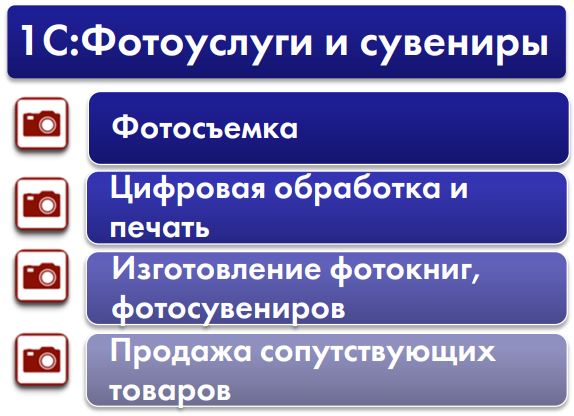 Решение «1С:Фотоуслуги и сувениры» разработано на основе типовой конфигурации «Управление нашей фирмой» ред. 3.0 на новейшей версии технологической платформы «1С:Предприятие 8.3», которая позволяет: