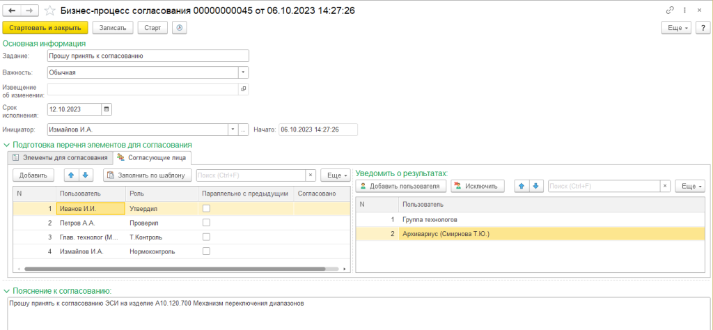 Пользователь может запускать электронное согласование конструкторско-технологической документации и электронной структуры изделия, перечень согласующих лиц может быть заполнен по шаблону. Кроме того, можно отследить на каком этапе запущенный процесс согласования был остановлен, и кто из согласующих не принял согласование к рассмотрению:
