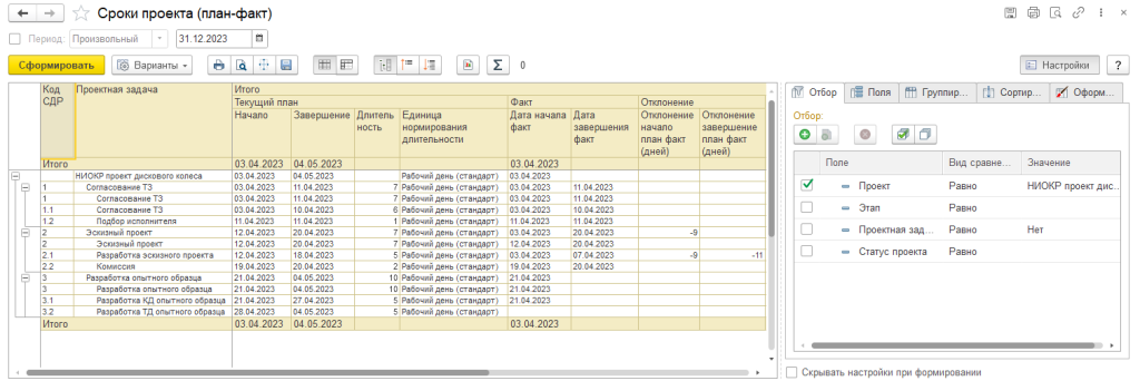 В рамках задачи по управлению работами и сроками проектов осуществляется планирование содержания и сроков работ, мониторинг и контроль выполнения проектных задач, а также анализ соответствия плановых и фактических показателей проекта с помощью отчета «Сроки проекта (план-факт) «.