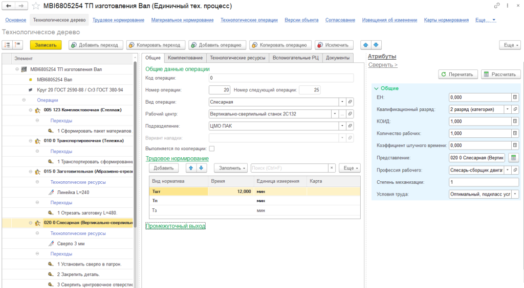 Каждая технологическая операция может быть дополнена перечнем технологических переходов, описывающих последовательные действия рабочего. Для сокращения трудоемкости формирования перечня переходов в системе предусмотрен удобный классификатор технологических переходов, который позволяет заполнять информацию из шаблона.