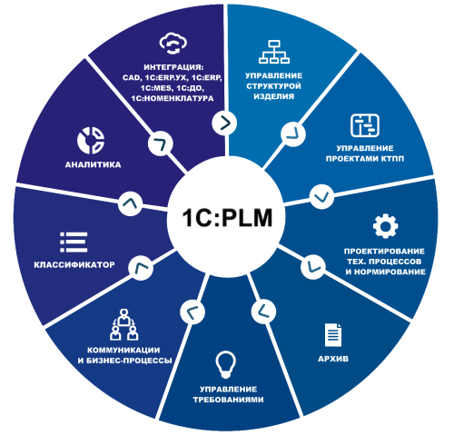 «1С:PLM Управление жизненным циклом» позволяет видеть информацию о всех составах изделий и упрощает процесс управления данными об изделии как на уровне контроля исполнения и координации работ по разработке и модернизации изделия, так и на уровне выполнения конкретных задач в части работ по разработке и изменению изделий.