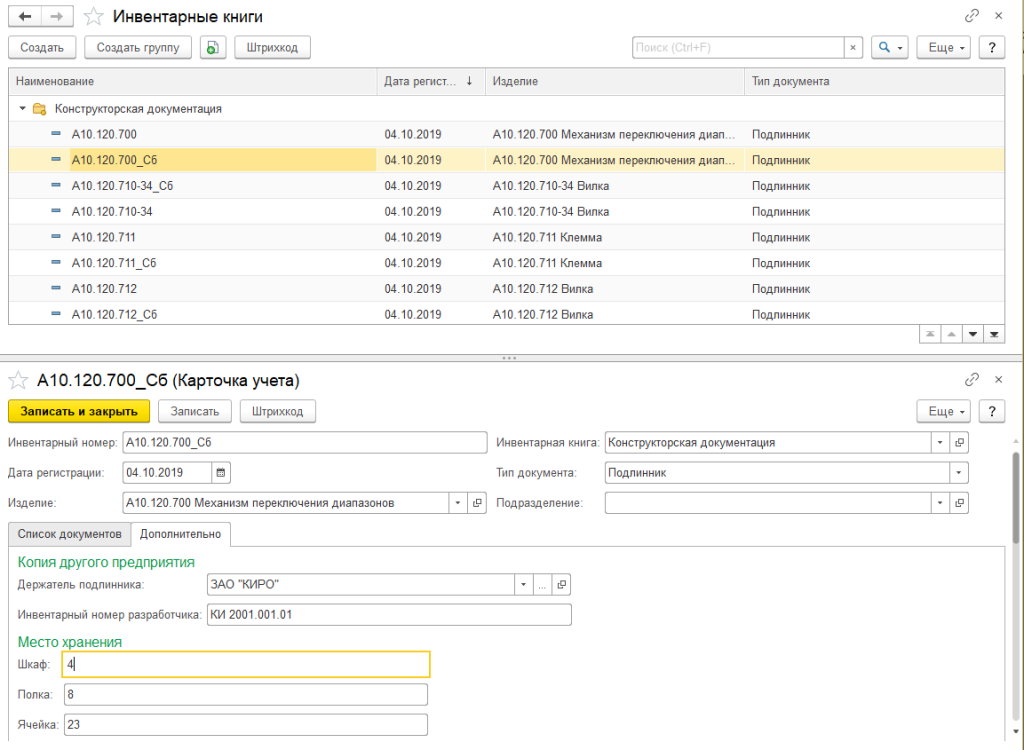 Управление информацией о бумажных подлинниках в электронном виде ведется согласно ГОСТ 2.501-2013 «Правила учета и хранения». Подсистема управления подлинниками, дубликатами и копиями документов позволяет вести учет документов, а также контролировать их выдачу, возврат и списание. Поставленным на учет документам присваивается уникальный инвентарный номер, в карточке учета содержится информация о физическом месторасположении документа, а также у какого предприятия имеется его подлинник.