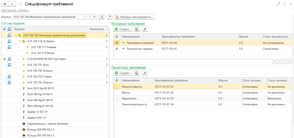 - Управление требованиями: формирование и контроль перечня исходных и проектных требований к изделию, матрица трассировок требований, управление спецификациями требований к изделиям, получение отчетности, позволяющей провести системный анализ по выполнению проектных требований к изделию;