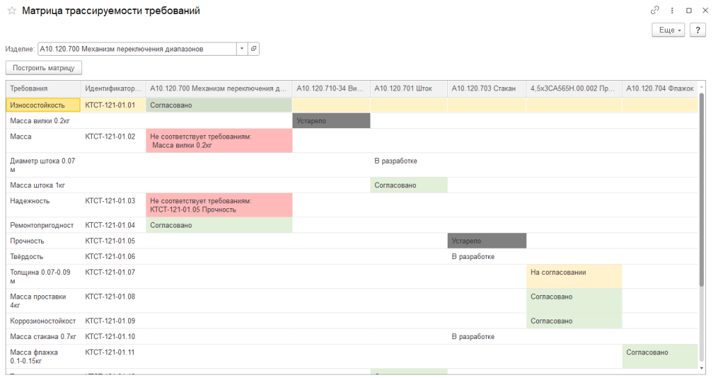 Матрица трассировок требований помогает пользователям получить информацию о статусе актуальности предъявляемых к изделию требований, а также отследить конфликтные ситуации, вызванные неактуальностью проектных требований.