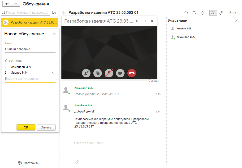 Встроенная в продукт система взаимодействия позволяет пользователям общаться посредством чатов, аудио или видео конференций, демонстрировать экран своего компьютера в ходе видеозвонка, и позволяет конструкторским и технологическим подразделениям оперативно взаимодействовать непосредственно в интерфейсе «1С:PLM Управление жизненным циклом».
