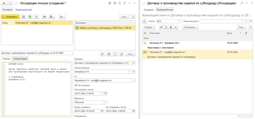 - взаимодействовать с сотрудниками и контрагентами через SMS, E-mail и встроенные средства коммуникации.