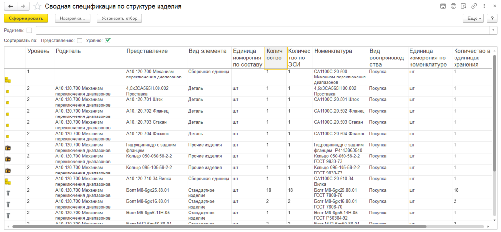 Сводные спецификации, ведомость покупных изделий, сводные ведомости материалов позволяют получить сводную информацию о составе изделия на всех уровнях вхождения, суммарном количестве материалов и покупных изделий, применяемых при изготовлении изделия. Для отчетов доступна возможность отбора данных в различных разрезах: вида изделий, вида получения изделий и материалов, метода суммирования количества материалов.
