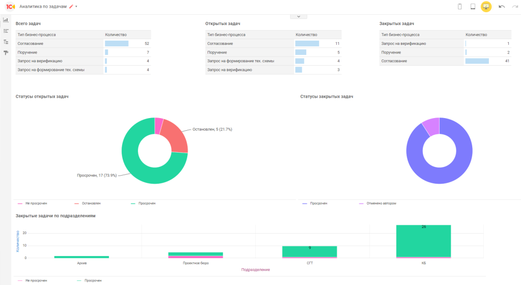 Аналитические панели позволяют получить информацию о стадии жизненного цикла каждого конкретного изделия или технологического процесса в разрезе общего набора данных. Пользователи могут оценить соотношение разрабатываемой и переданной в архив КТД, а ограничительный перечень позволит определить список изделий в рамках одной стадии и осуществить быстрый переход на карточку конкретного изделия или технологического процесса для получения более подробной информации.