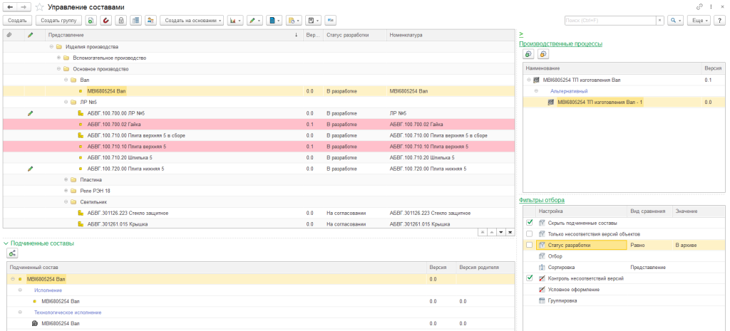 Управление составом изделия: управление конструкторским, технологическим, производственным составами изделия, управление версиями, исполнениями и заменами составов изделия, сравнение составов, поиск входимостей, согласование и контроль актуальности конструкторско-технологической документации (КТД) и составов, проведение инженерных изменений, отчеты по ЕСКД;
