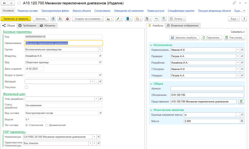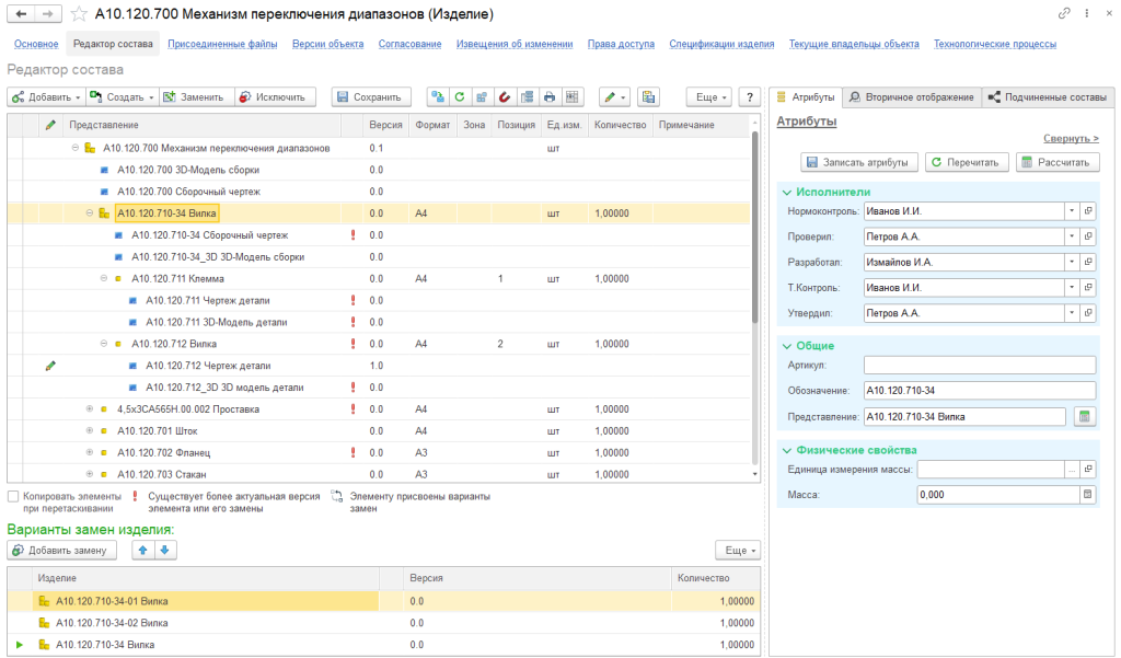 Система позволяет формировать состав изделия (цифровой двойник изделия), управлять документами в рамках состава изделия, управлять вариантами и заменами. Управление информацией об изделии ведется на нескольких уровнях: