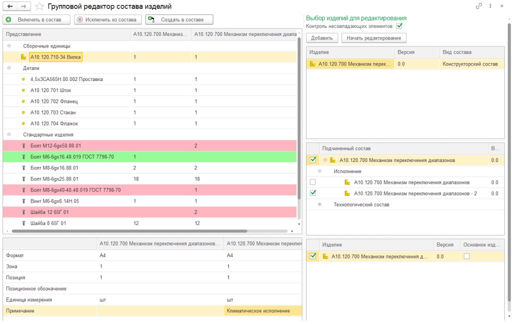 Пользователь может осуществлять групповое изменение и сравнение составов изделий. Это позволяет сравнивать как различные версии одного состава, так и разные составы изделия на протяжении его жизненного цикла: