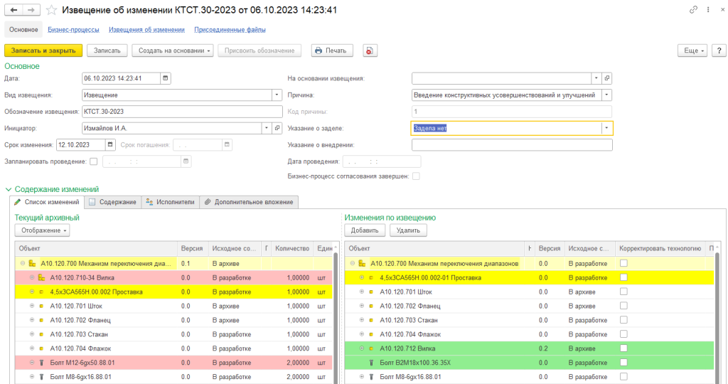 Система позволяет проводить изменения как в формате извещения об изменении, так и в упрощенном формате автоматического оповещения абонентов об изменении версии. Использование этих инструментов позволяет вести детальную историю изменений данных об изделии и получать в режиме реального времени информацию о проведении изменений: