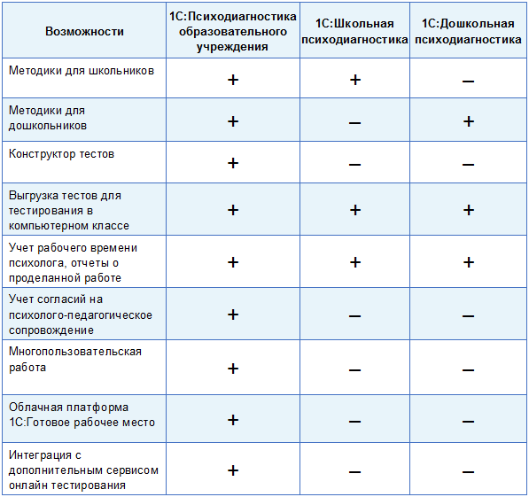 В программный продукт включены все психодиагностические методики из решений «1С:Школьная психодиагностика. Базовая версия» и «1С:Дошкольная психодиагностика. Базовая версия», которые в настоящее время внедрены и используются более чем в 3 000 образовательных учреждениях России.