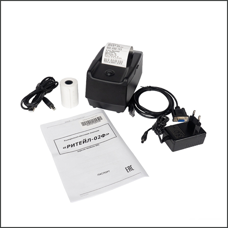 ККТ «РИТЕЙЛ-02Ф», кабель USB, кабель COM, блок питания |