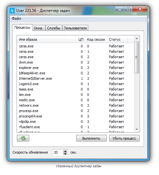 Режим «Удаленный диспетчер задач» предназначен для того, чтобы управлять приложениями, окнами, службами и пользователями удаленного компьютера на соответствующих вкладках главного окна данного режима.