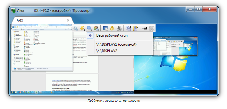 Если на удаленном компьютере несколько мониторов, вы имеете возможность подключиться к любому из них, либо отобразить их все в одном окне.