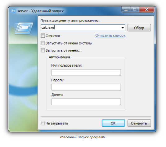 Режим «Удаленный запуск» предназначен для открытия документов или запуска программ на удаленном компьютере напрямую, без получения доступа к удаленному экрану. Данный режим избавит вас от того, чтобы подключаться каждый раз к удаленному рабочему столу, для совершения такой рутинной операции, как запуск программы.