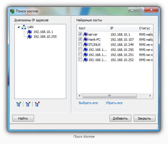 Viewer обладает встроенной системой поиска Хостов в сети. Поиск осуществляется по заданным диапазонам IP-адресов, таким образом есть возможность настраивать зоны сканирования. Поиск осуществляется в многопоточном режиме, что позволяет сканировать большие сегменты сети за очень короткий промежуток времени. Имеется возможность указывать число потоков сканирования.