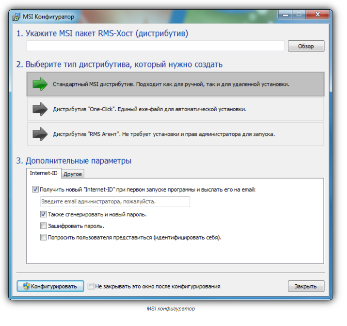 MSI конфигуратор — это встроенная утилита Клиента, которая позволяет настроить нужным образом дистрибутив Хоста, перед тем, как производить его установку (как ручную, так и удаленную).