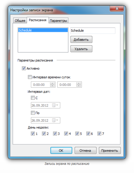 Режим «Запись экрана» позволяет следить за действиями пользователя полностью автономно от Клиента (Viewer). Т.е. администратор, с помощью удобного пользовательского интерфейса, может задать расписание, которое, если перевести на человеческий язык, выглядит так — «Делать снимок каждые 2 минуты, по рабочим дням с 8 утра до 5 вечера».