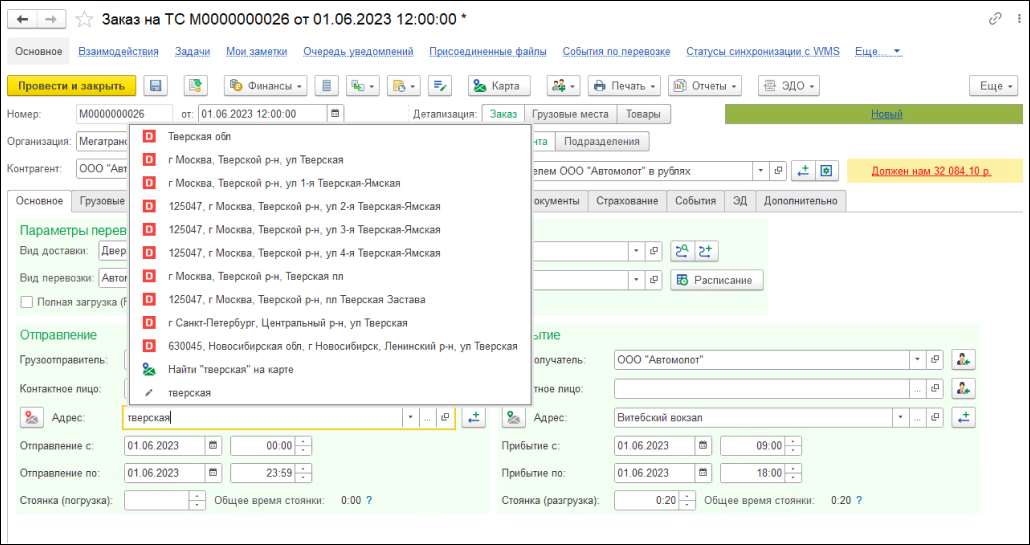 DaData доступен при вводе адреса в документе «Заказе на ТС», справочнике «Пункты назначения», обработке «Электронные карты». Сервис можно использовать как альтернативу для геокодирования наряду с OSM и Яндекс.