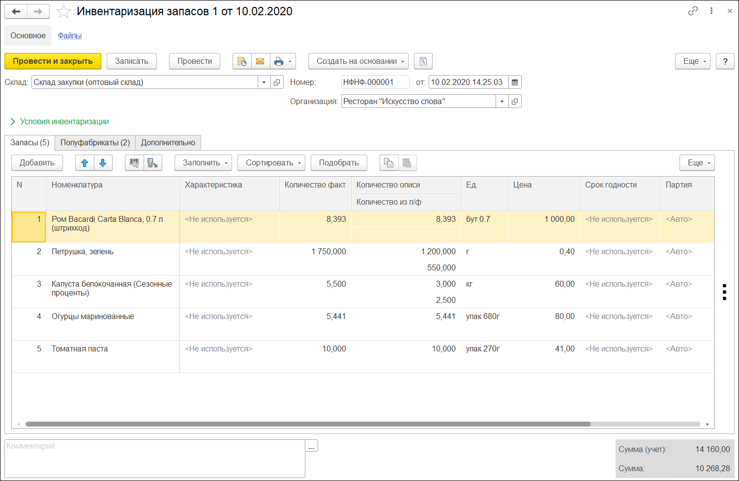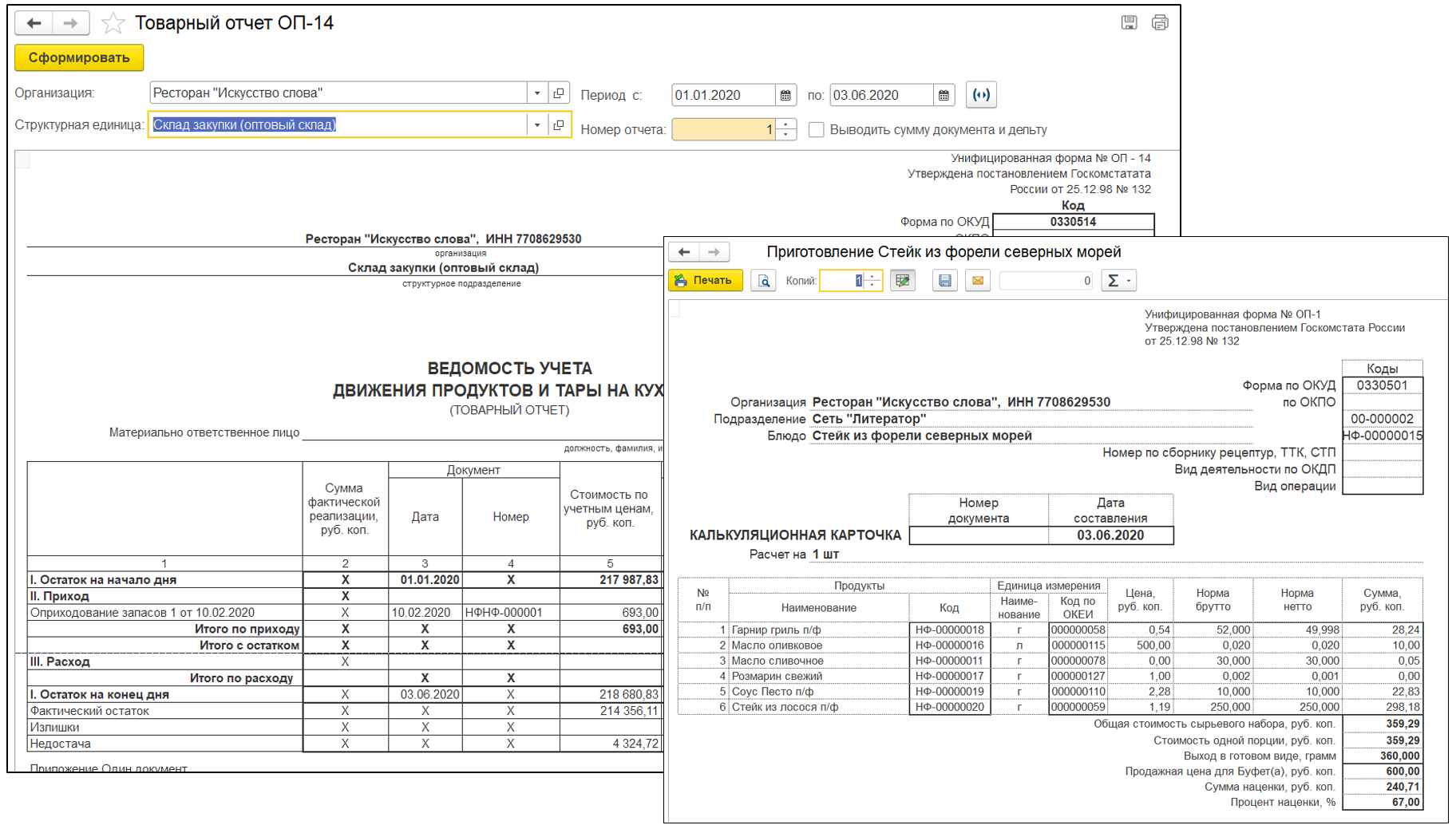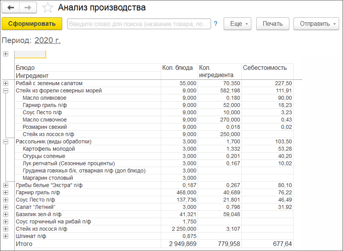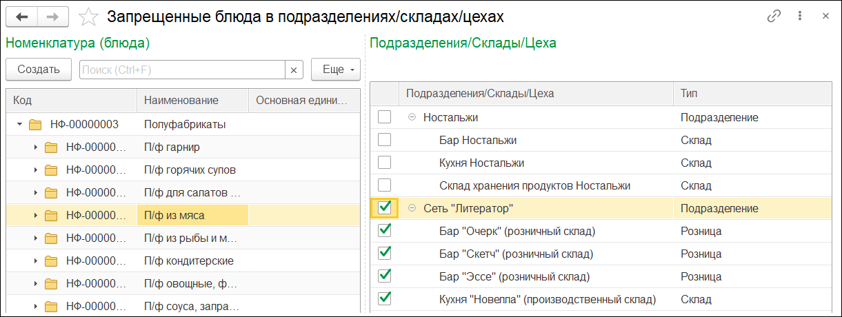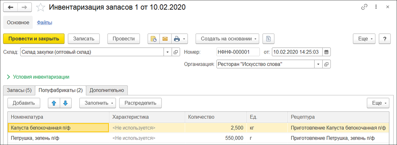 Также есть возможность проводить инвентаризацию полуфабрикатов и готовых блюд с автоматическим раскладыванием их на ингредиенты согласно рецептурам.