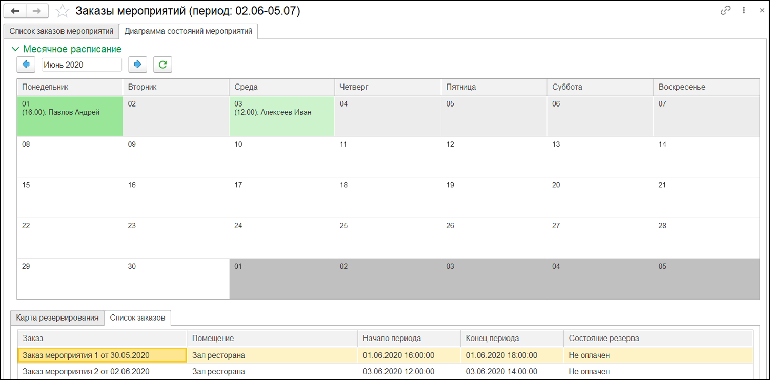 Расширенная область единиц измерения позволяет удобно проводить инвентаризацию бара. При создании номенклатуры, пользователь должен взвесить бутылку, указать массу нетто и брутто, а также плотность напитка. Затем при проведении инвентаризации программа сможет автоматически вычислить остаток напитка во вскрытой бутылке. БАНКЕТЫ И МЕРОПРИЯТИЯСпециализированный интерфейс работы с Мероприятиями позволяет вести полноценное планирование банкетов и прочих мероприятий. При создании заказа мероприятия открывается форма, куда вносится вся информация, полученная от клиента. Вкладка «Анкетирование» поможет менеджеру не упустить важные вопросы, которые необходимо задать потенциальному гостю. В программе предусмотрено создание индивидуальных шаблонов анкеты. Вкладка «Товары и блюда» хранит информацию о заказанных позициях, их количестве, стоимости и т.д. В ней же есть возможность создавать и просматривать другие варианты блюд, которые были предложены клиенту. При расчете можно добавлять услуги и позиции сопутствующих товаров, например, украшение зала или воздушные шарики и цветы, которые необходимо приобрести. В платёжном календаре фиксируется график платежей от заказчика. Вкладка «Помещения» позволяет менеджеру планировать занятость залов и видеть все предстоящие мероприятия. В календаре учитывается график работы заведения, можно задавать типы помещений и временной шаг (до получаса). Цветовые индикаторы помогут сотруднику быстрее ориентироваться в таблице, в том числе по времени начала и окончания мероприятия. Кликнув на событие можно перейти прямо в заказ.