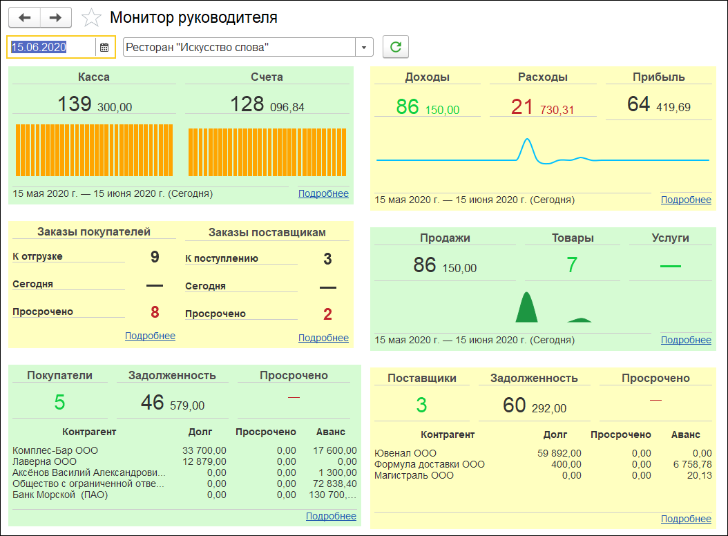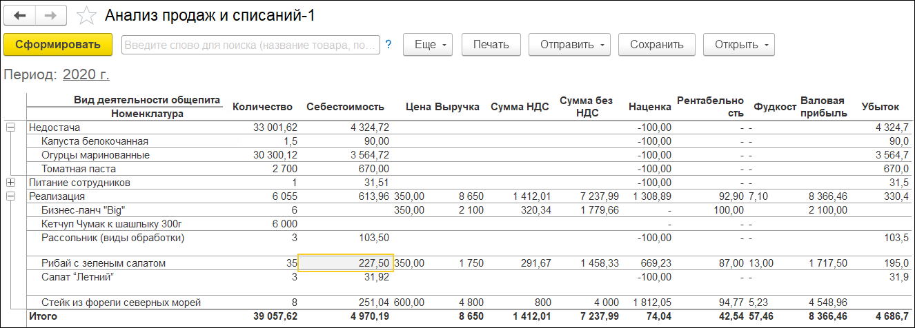 ОТЧЕТЫ И КОНТРОЛЬ БИЗНЕСАБлагодаря бесшовной интеграции отраслевого функционала с типовой конфигурацией, все отчеты конфигурации «Управление нашей фирмой» полноценно функционируют в «1С:Управление предприятием общепита». Кроме этого, в решение добавлены многочисленные специализированные отчеты и печатные формы. Калькуляции за период позволяют проанализировать статистику выпуска блюда и динамику прямой себестоимости. Анализ продаж и списаний – получить общие показатели деятельности с учетом продаж и прочих операций.