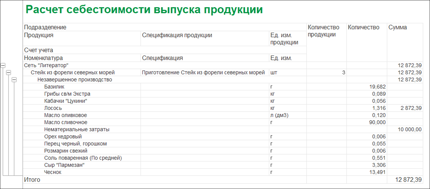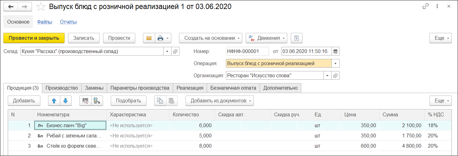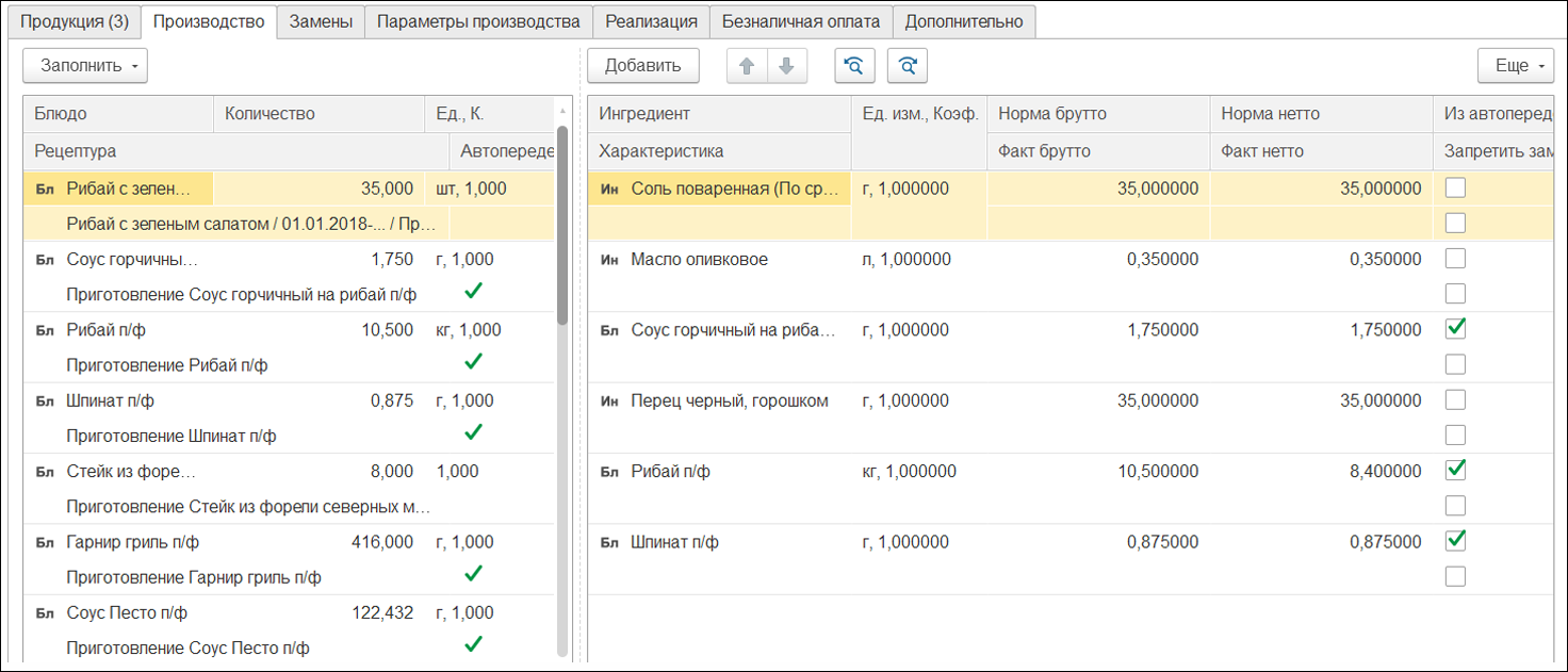 Технологический ингредиент. Существует возможность добавить технологический ингредиент, т.е. тот ингредиент, который присутствует в составе рецептуры, но не влияет на себестоимость состава блюда. Классический пример — вода водопроводная. Работа с бизнес-ланчами и модификаторами. Программное решение поддерживает работу с модификаторами и бизнес-ланчами. Для блюд и бизнес-ланчей есть возможность добавлять модификаторы, которые войдут в состав производства. В дальнейшем можно получить информацию по себестоимости блюд и бизнес-ланчей с учетом модификаторов. Учет приготовления полуфабрикатов и блюд, а также количества и сумм списанных в производство ингредиентов, согласно заведенным ранее рецептурам, с возможностью оценки потребностей ингредиентов и их обеспечения.