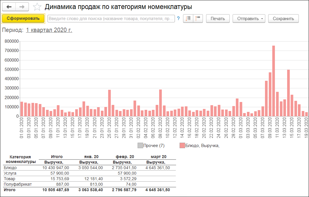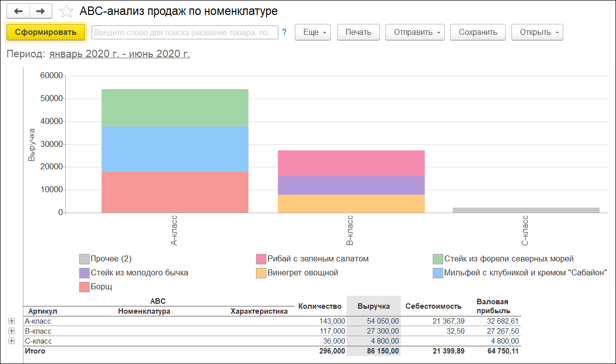 Отчеты Движения по видам операций и Остатки и обороты по видам операций позволяет получить самую полную картину движения товара или блюда. Отчет по себестоимости позволяет наиболее точно рассчитать себестоимость до выпуска продукции, исходя из реальных остатков и партий на складах. Рейтинг продаж, ABC-Анализ продаж и Динамика продаж – классические инструменты по анализу реализации.