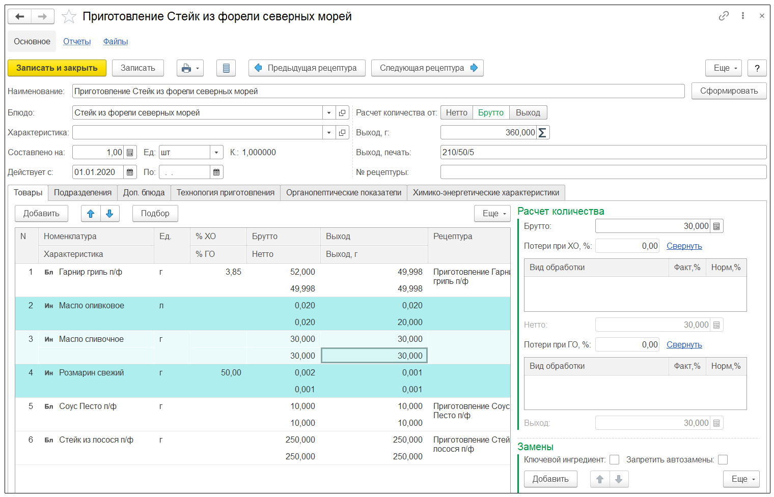 РЕЦЕПТУРАВ рецептуре блюда можно подробно описать технологию приготовления, а также задавать следующие учетные показатели: количество ингредиента брутто, процент потерь после холодной обработки, количество ингредиента нетто, процент потерь после горячей обработки, количество ингредиента выход.