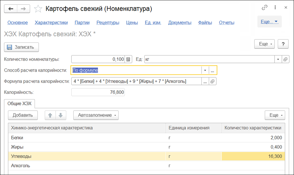В системе реализован учет химико-энергетических характеристик блюд, их калорийности и пищевой ценности. Сводные показатели на блюдо рассчитываются автоматически по сумме составляющих блюда ингредиентов и их можно распечатать.