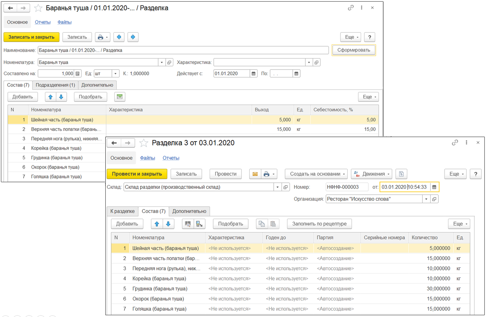 Для упрощения работы с программой предусмотрена загрузка списка ингредиентов, блюд и рецептур с химико-энергетическими показателями (с заполнением соответствующих справочников и документов) из электронного онлайн-сборника рецептур FoodCOST. Дополнительно можно использовать несколько рецептур с автоматическим определением нужной на момент приготовления. Для сложных рецептур реализован механизм учета «блюдо в блюде» с неограниченным количеством уровней вложенности, что позволяет учесть все, даже самые сложные процессы производства блюд и полуфабрикатов на предприятии. Разные подразделения предприятия могут использовать различные рецептуры на одно и то же блюдо. Рецептуры также могут иметь различный срок действия. Всплывающие индикаторы дают возможность пользователю с помощью наведения курсора мыши быстро различать тип продукции в большом списке (Ингредиент, Блюдо, Бизнес-ланч, Модификатор) и не тратить время на лишние клики. КУХНЯ И ВЫПУСК ПРОДУКЦИИОперация разделки. Данный функционал позволяет учитывать все составные части после разделки цельного сырья (мясной туши или цельной рыбы) для последующего использования в рецептурах приготовления.