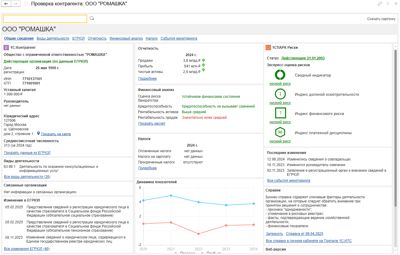 Фирма «1С» продолжает развивать инструменты проверки надежности контрагентов в программных продуктах системы «1С:Предприятие».